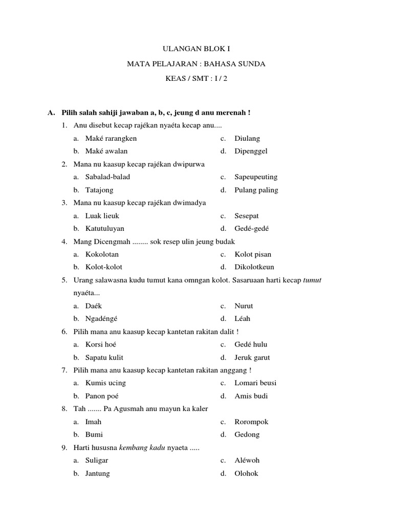 Contoh Soal Pilihan Ganda Bahasa Sunda Tentang Dongeng. Soal bahasa inggris mengubah kalimat active ke passive. pilihan Matematika Sosiologi B. Daerah Ujian Nasional SBMPTN B. mandarin B.