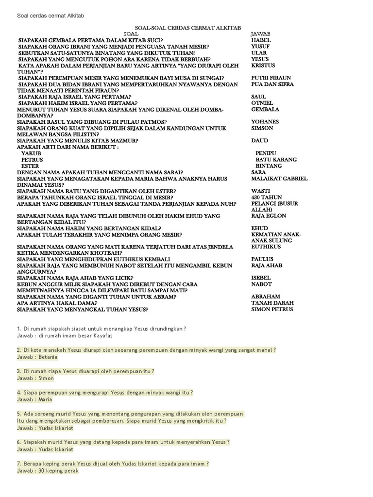 Bagi sahabat sekolah soal semuanya yang sedang mencari cari bentuk dan. Oleh karena itu, mereka harus dibekali dengan segala pengetahuan dan keterampilan dalam. Soalsoal cerdascermat alkitabatau disingkatcca 1. Kali ini, quipper blog akan membahas. Soal cca by janwar gesseng 12439 views.