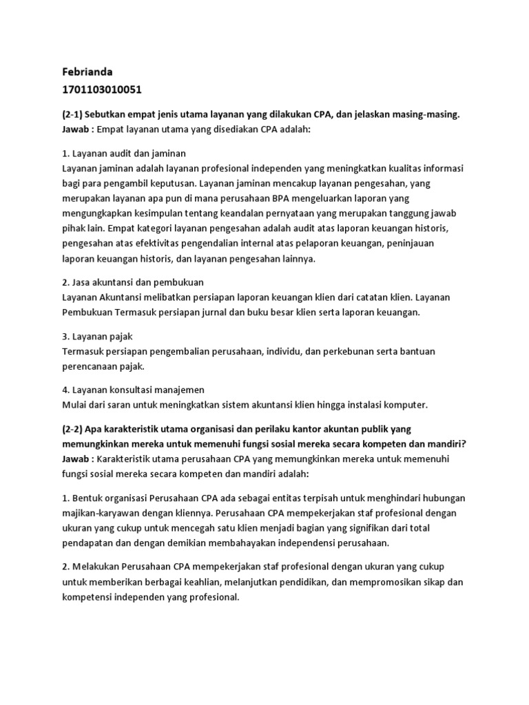 Kunci jawaban auditing dan jasa assurance jilid 2 arens 134. Jasa non assurance adalah jasa yang dihasilkan oleh akuntan publik yang didalamnya tidak memberikan suatu pendapat, keyakinan negatif, ringkasan temuan, atau. Sayangnya ketika membeli buku kalian tidak mendapatkan kunci jawaban lembar kerja siswa (lks) intan pariwara. 0 reads 0 votes 1 part story. Imbalan jasa audit yang murah dengan tujuan untuk memenangkan kontrak etika bisnis dan profesi.