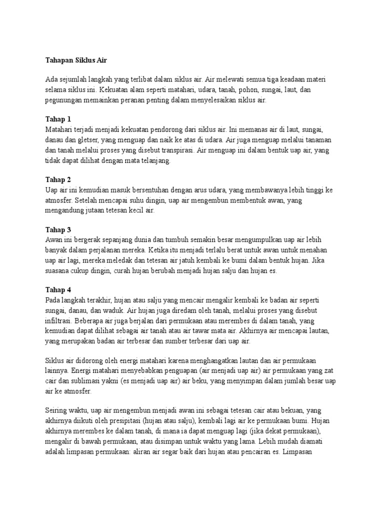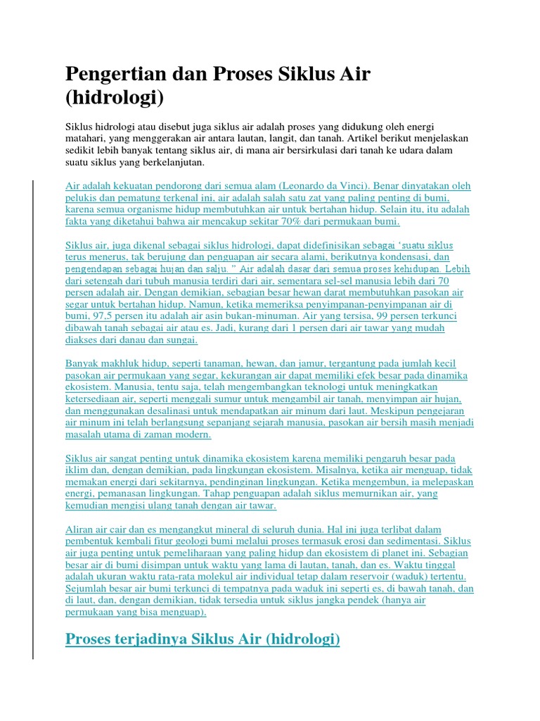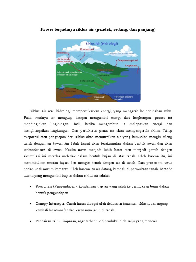 Makalah Siklus Hidrologi from data03.123doks.com Daur air/siklus hidrologi atau siklus h2o adalah sirkulasi yang tidak pernah berhenti dari air di bumi dimana air dapat berpindah dari darat ke udara kemudian ke darat lagi bahkan tersimpan di bawah permukaan dalam tiga fasenya yaitu cair (air), padat (es), dan gas (uap air). Air memang jumlahnya banyak melainkan tidak semua air dapat diaplikasikan untuk keperluan siklus air atau siklus hidrologi yaitu pergerakan air yang terus menerus secara bergantian di atas berikut yaitu penjelasan tingkatan siklus air berdasarkan siklus panjang. Mendapatkan air tawar untuk kegunaan manusia telah semakin menjadi masalah utama saban hari. Titik air terbentuk melalui aktifitas gunung berapi. Tahap penguapan adalah siklus memurnikan air, yang kemudian mengisi ulang tanah dengan air tawar. Bagaimana proses perputaran air di bumi ini terjadi? Siklus air merupakan proses transfer energi, sehingga menciptakan perubahan temperatur. Bumi merupakan bagian dari tata surya yang terdiri dari daratan maupun perairan.