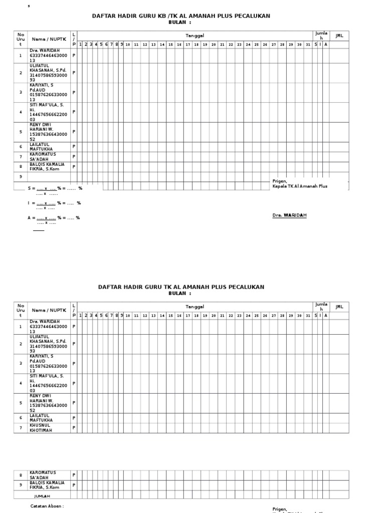 Paud jateng september 13 2015 administrasi paud lengkap download contoh buku raport paud untuk kk tpa tk playgroup format baru sesuai dengan standar paud permendikbud 137 tahun 2014. Contoh daftar hadir rapat pertemuan sekolah format. Contoh surat undangan rapat panitia pernikahan di 2020 kartu pernikahan desain. Cover buku absen guru unduh file guru. Dalam sebuah notula rapat minimal memuat informasi hari dan tanggal peserta yang hadir agenda rapat tanggapan dan solusi. Sekian penyampaian artikel siang hari ini semoga. File ini berguna sebagai pelengkap dalam administrasi guru dan administrasi sekolah yang akan menunjang dalam setiap kegiatan yang akan dilaksanakan di sekolah. Buku absensi guru ini dapat digunakan untuk mengabsen pendidik dan tenaga kependidikan di sebuah lemabaga paud. Aplikasi jadwal pelajaran sd format microsoft excel; Jika ada pertanyaan, kirim pesan anda. Paud jateng september 5, 2015 administrasi paud lengkap. Download file dibawah ini : Laporan bulanan berisi tentang keadan kelas dan mutasi, data tutor / guru dan pengelola, daftar hadir guru, data pengurus dan tutor, dan pengelola dan tutor.